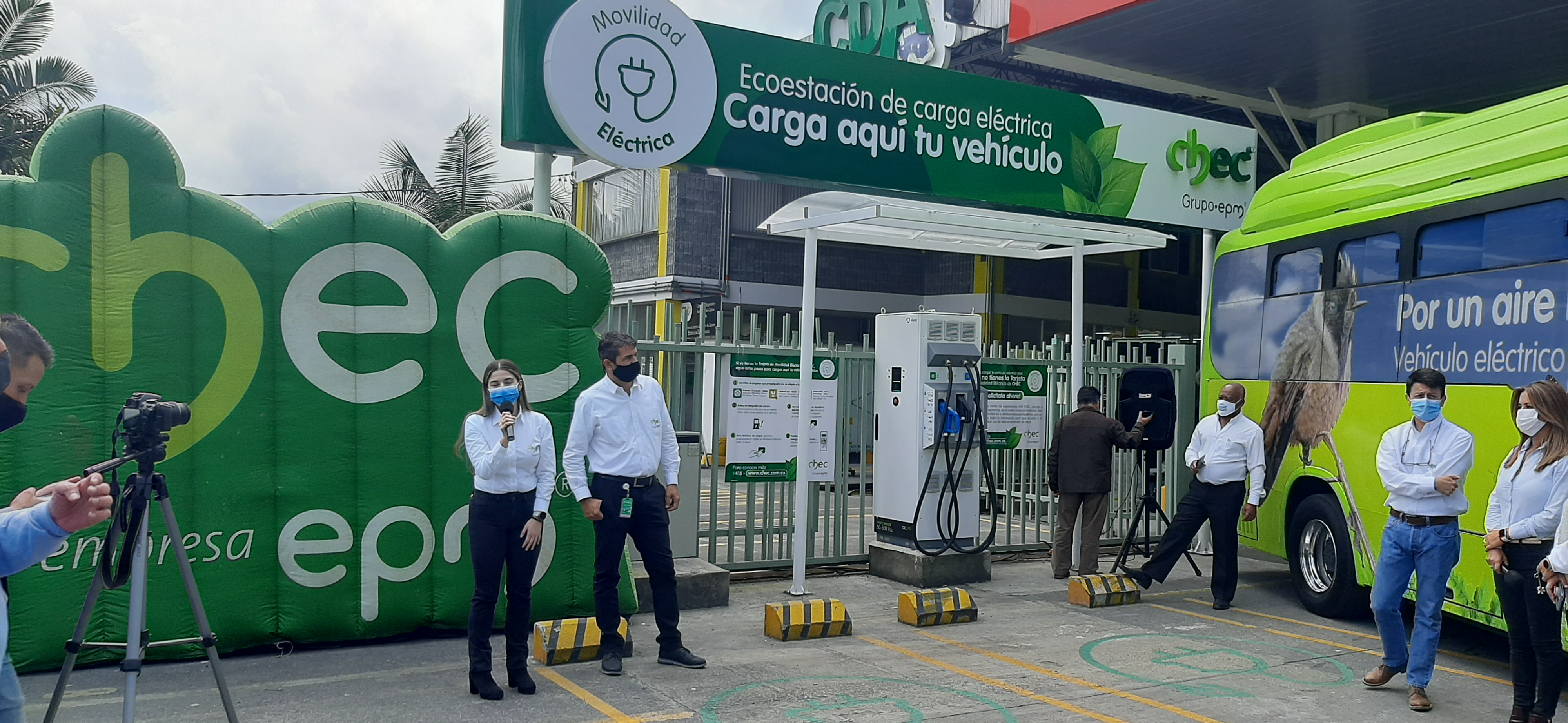 El gerente de la CHEC Grupo EPM de Caldas, Santiago Villegas Yepes, acompañado de su equipo de Comunicaciones, realizó hoy la apertura oficial de la segunda ecoestación pública de carga para vehículos eléctricos, que estará al servicio de los habitantes de Manizales y de los visitantes que lleguen a la ciudad haciendo uso de un carro eléctrico.